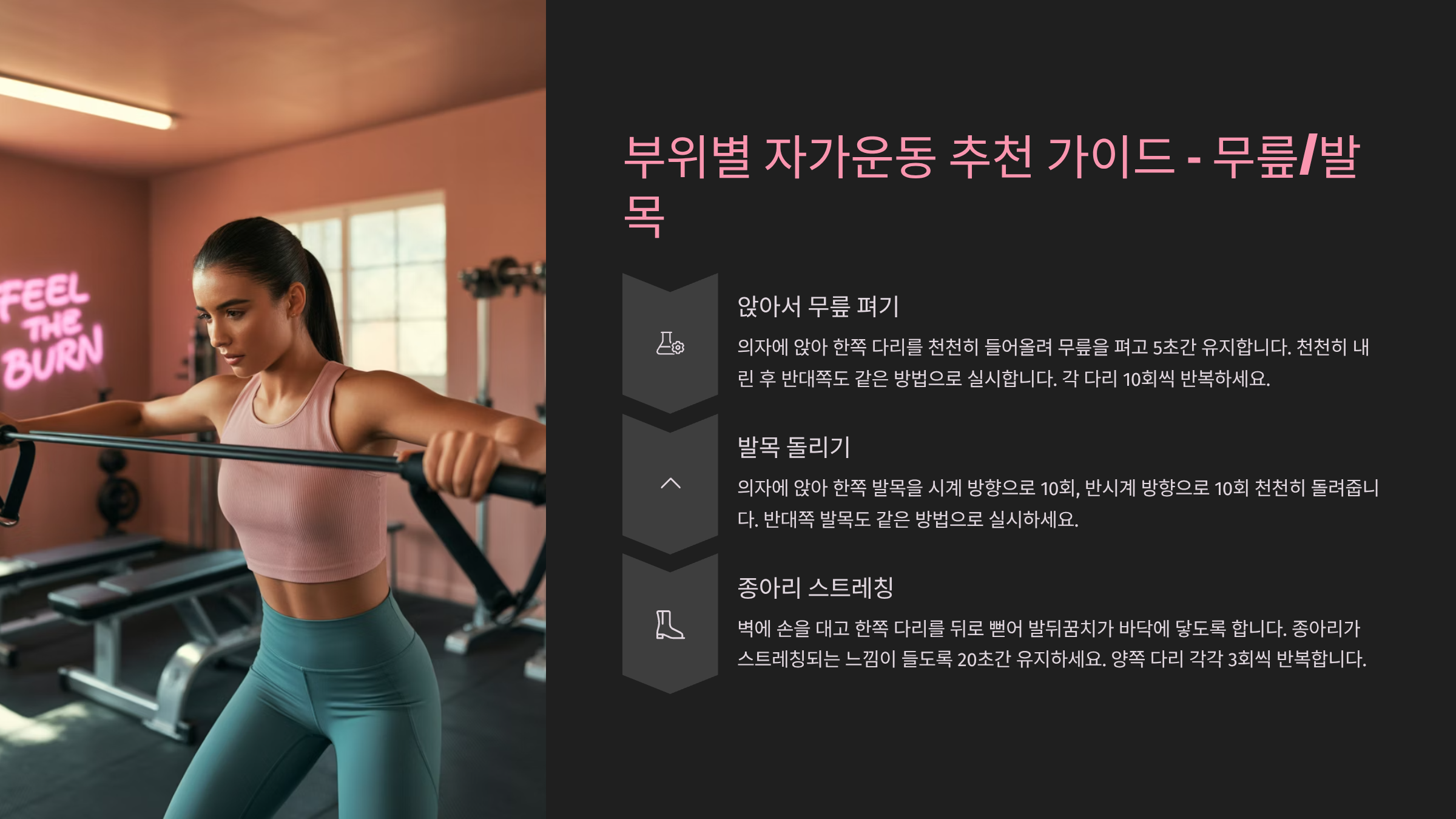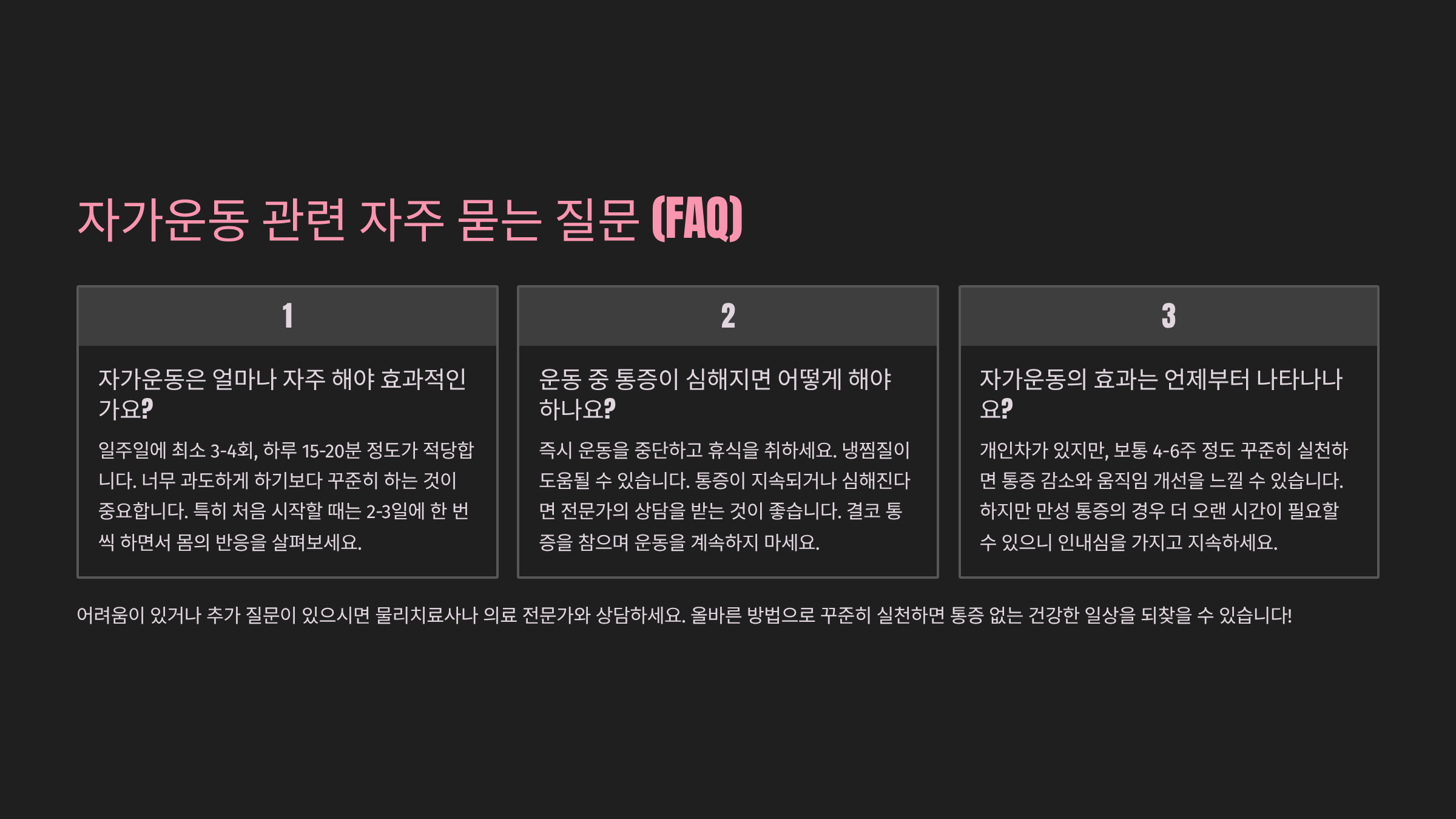 이처럼 부위별 특성에 따라 맞춤형 자가운동을 실천하는 것이 빠른 회복의 열쇠예요.