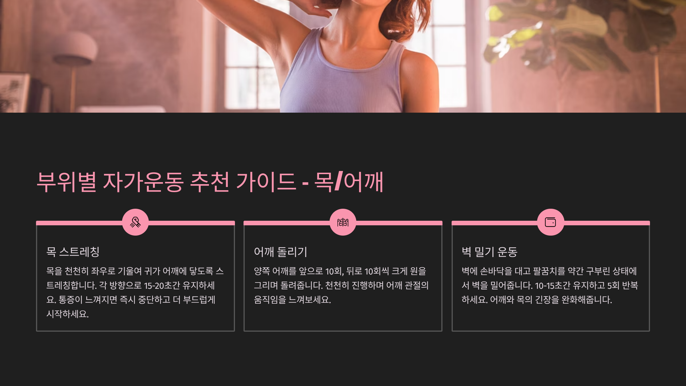 | 어깨 | 수건 스트레칭, 팔 올리기, 벽 짚기 |