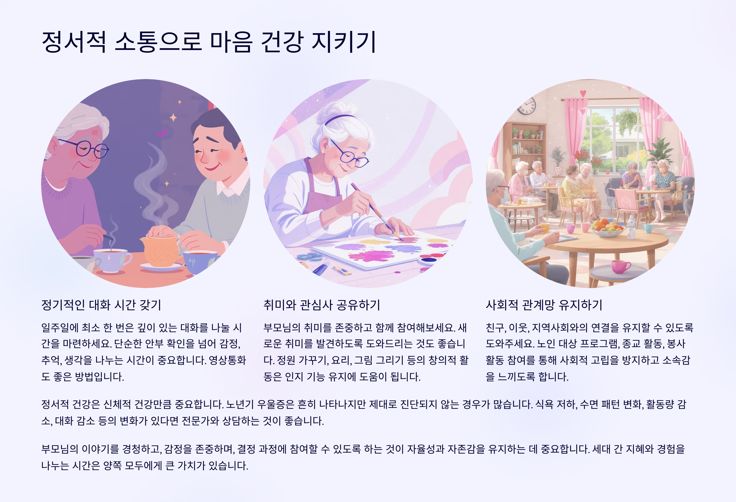 신체 건강만큼 중요한 게 바로 마음의 건강이에요. 부모님은 자식 걱정에 속마음을 숨기시는 경우가 많아요. 자주 대화하며 감정을 나누는 것이 가장 큰 치유가 되죠.