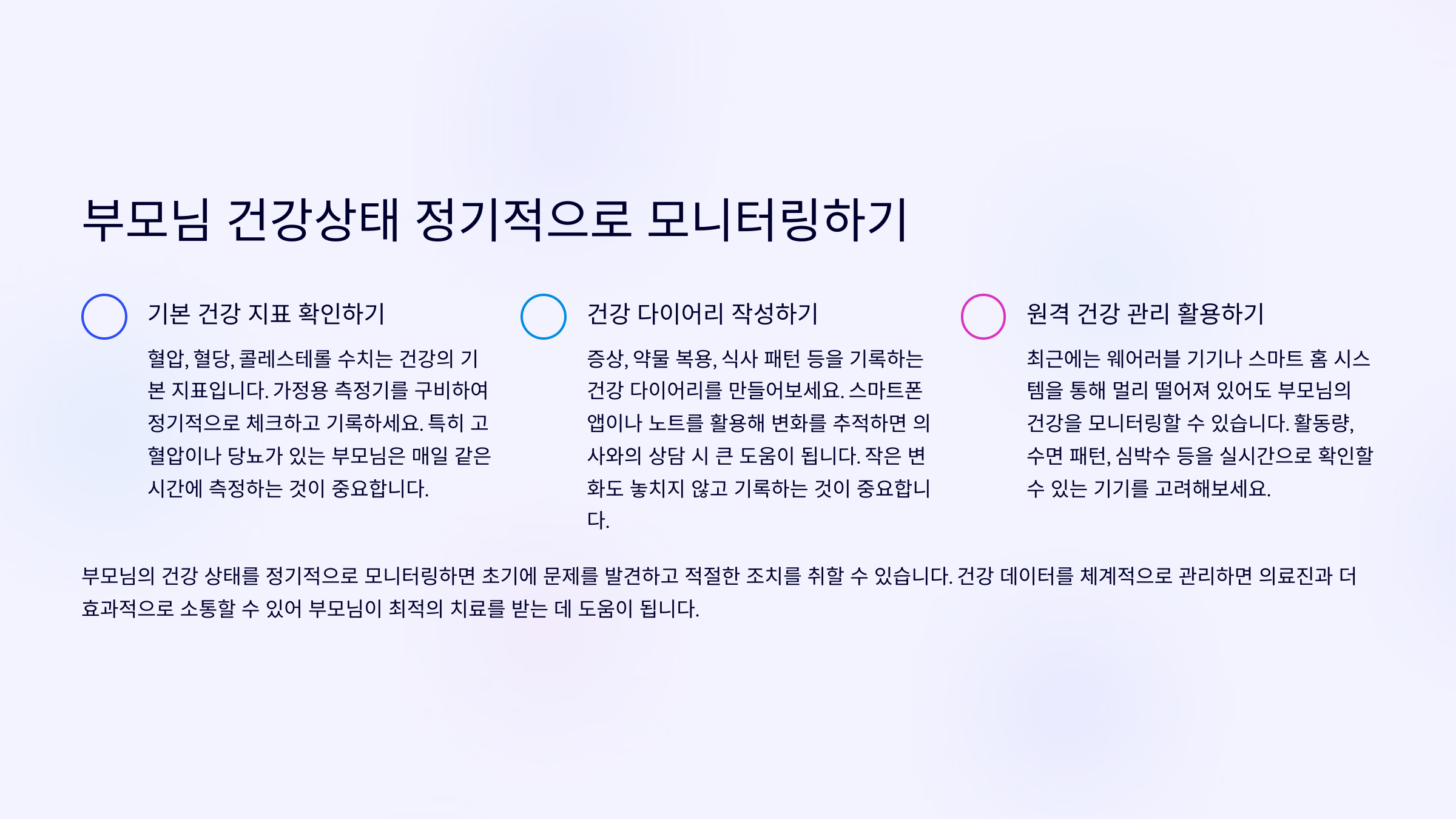 이제부터 부모님 건강을 지키기 위한 구체적인 방법들을 하나씩 알아볼게요! 각 항목은 자동으로 이어져서 쭉쭉 나올 거예요 😊