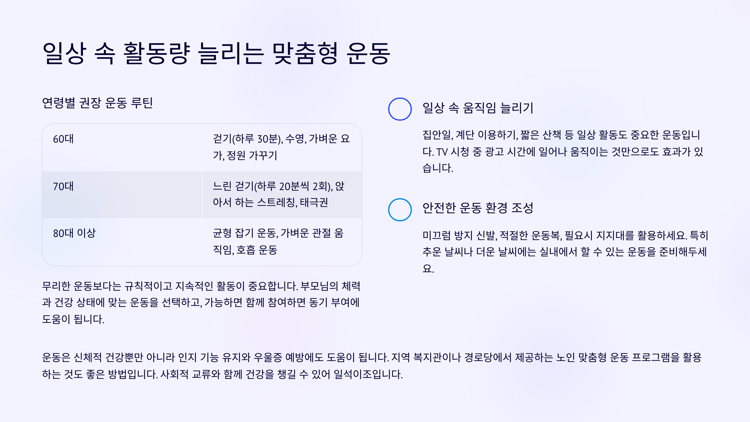 운동은 건강 유지에 있어 빠질 수 없는 요소예요. 부모님께 특별한 운동을 강요하기보다 일상 속에서 자연스럽게 움직이게 돕는 것이 현실적이에요.