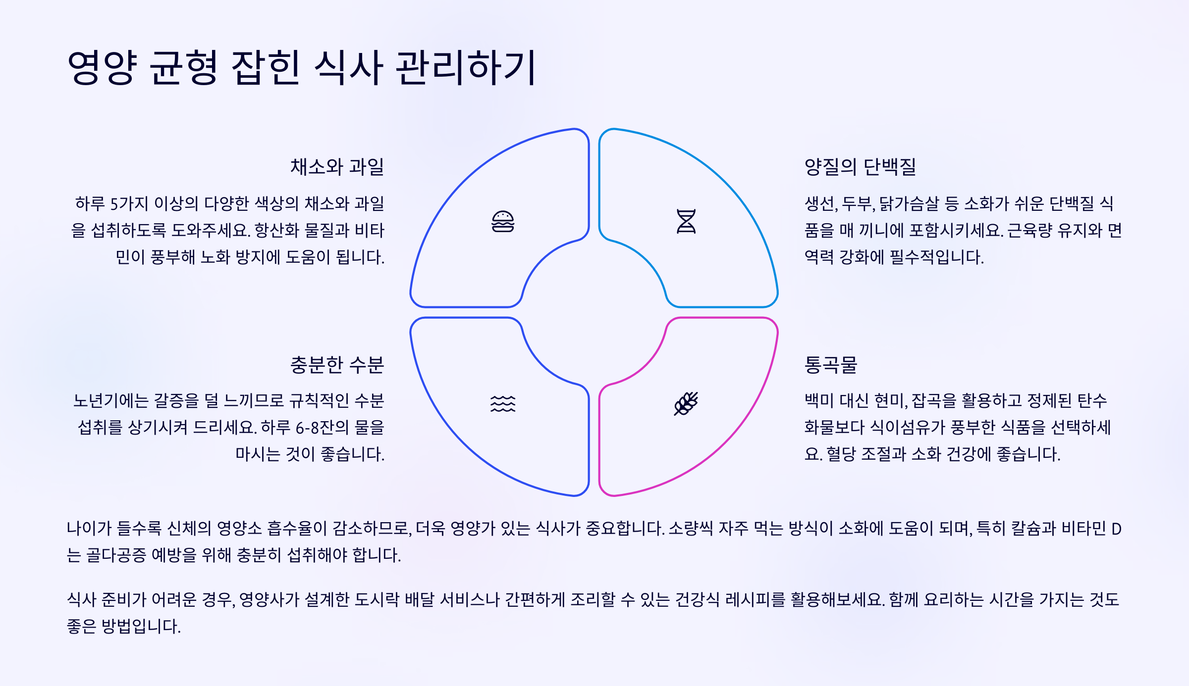 부모님 건강의 기본은 식사에서 시작돼요. 특히 노년기에는 소화 기능이 약해지고 식욕이 줄기 쉬워서 영양이 골고루 들어간 식사가 필요해요.