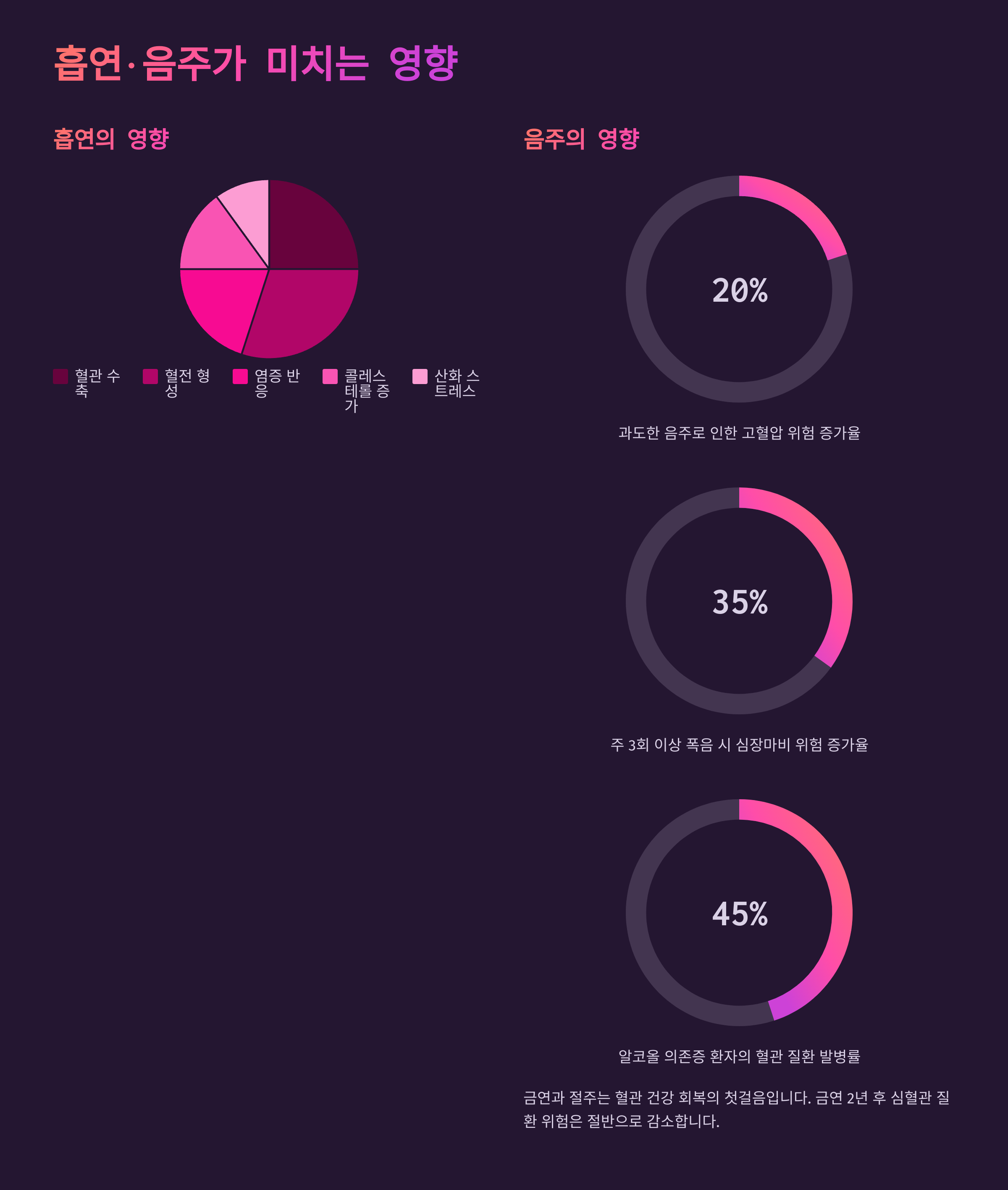 만약 술·담배를 동시에 한다면 그 위험성은 배가돼요. 혈관이 지속적으로 자극받기 때문에 노화가 빨라지고, 동맥경화가 더 빨리 진행될 수 있어요.
