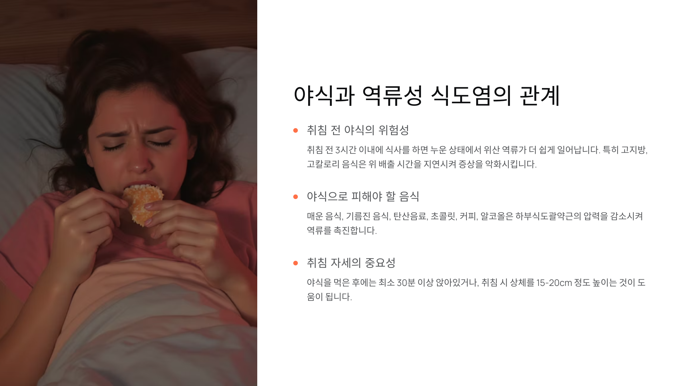 야식이 문제되는 이유는 단순히 ‘먹고 눕는다’가 아니라, 위산 분비가 활발한 시간에 위에 음식물이 쌓이는 것이에요. 특히 매운 음식, 튀긴 음식, 탄산음료와 알코올은 위산을 더 많이 분비하게 해서 식도염을 유발해요.