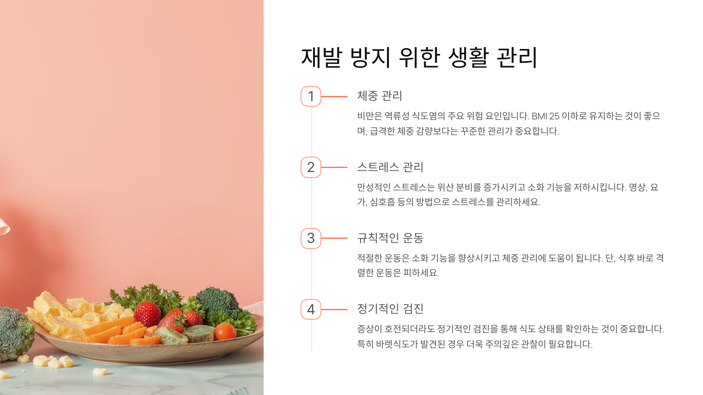 역류성 식도염은 재발이 매우 흔한 질환이에요. 따라서 약으로 좋아졌다고 끝내지 말고, 평소 생활습관 관리가 반드시 병행돼야 해요. 가장 기본적인 건 올바른 식사 습관과 수면 자세 유지예요.