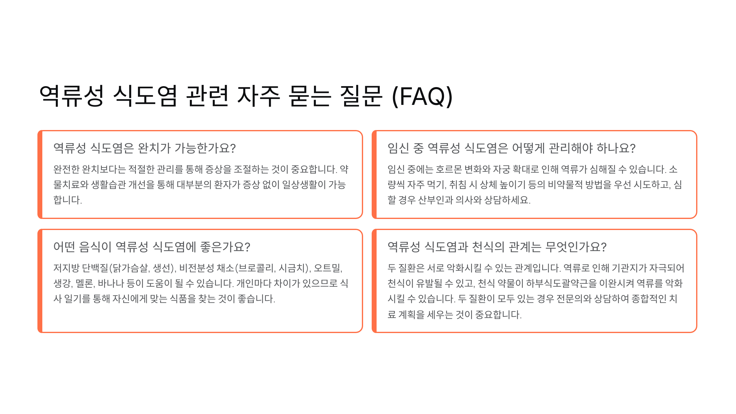 역류성 식도염은 단순한 속쓰림으로 오해받기 쉬운 질환이에요. 하지만 장기간 방치하면 식도염이 만성화되고, 심한 경우에는 식도암으로 발전할 가능성도 있어요. 그래서 초기에 증상을 잘 구별하고 빠르게 대응하는 게 정말 중요해요.