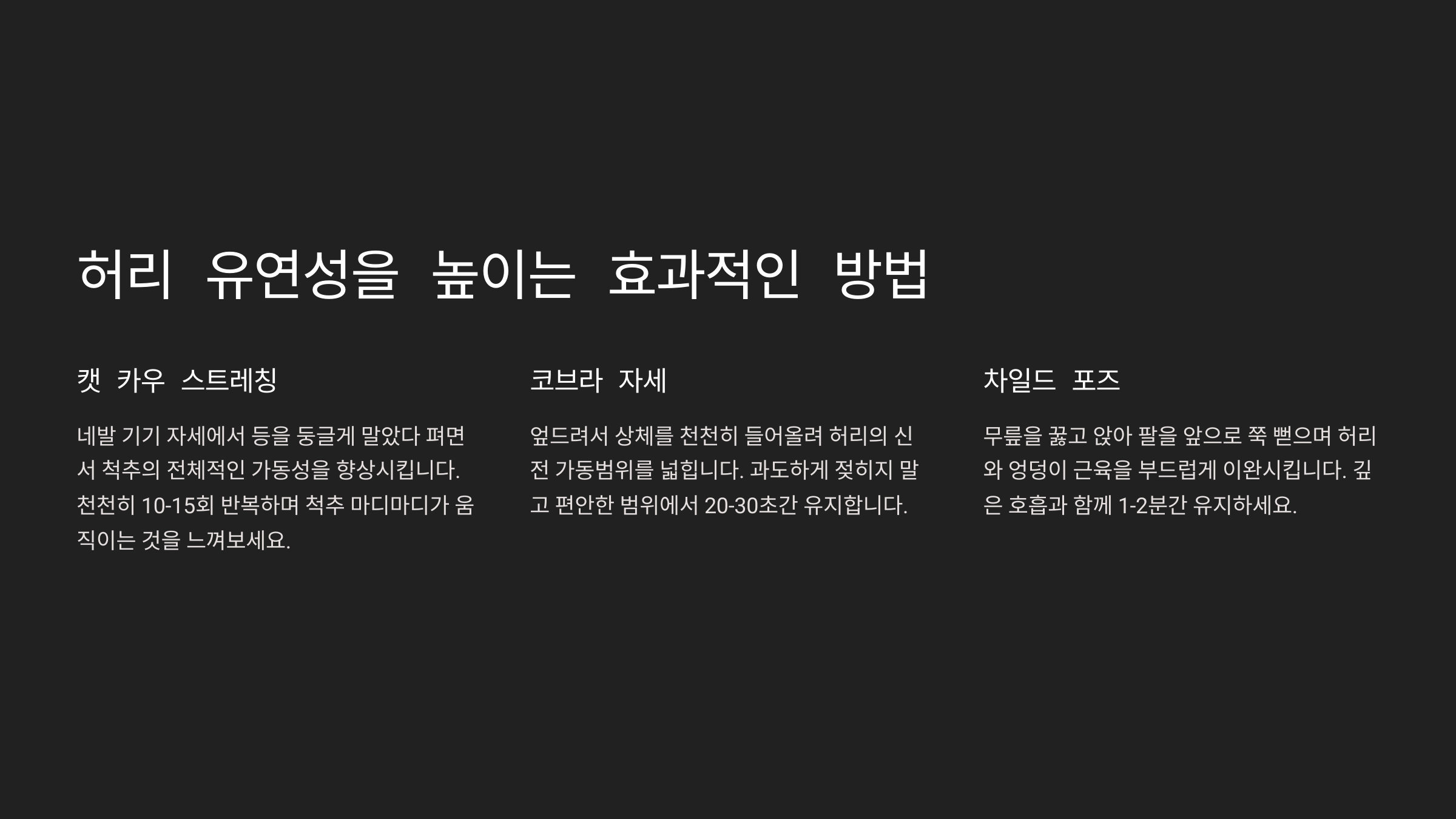 이렇게 척추를 다양한 각도로 늘리고, 연결 부위까지 함께 스트레칭하면 허리가 더 부드러워지고 움직임도 자연스러워져요.