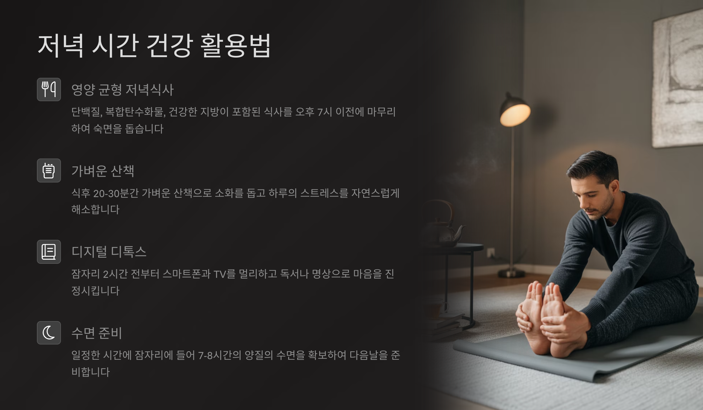 하루를 잘 마무리해야 다음 날을 잘 시작할 수 있어요. 저녁 루틴은 회복과 정리의 시간이에요. 몸과 마음을 차분히 가라앉히는 것이 핵심이에요.