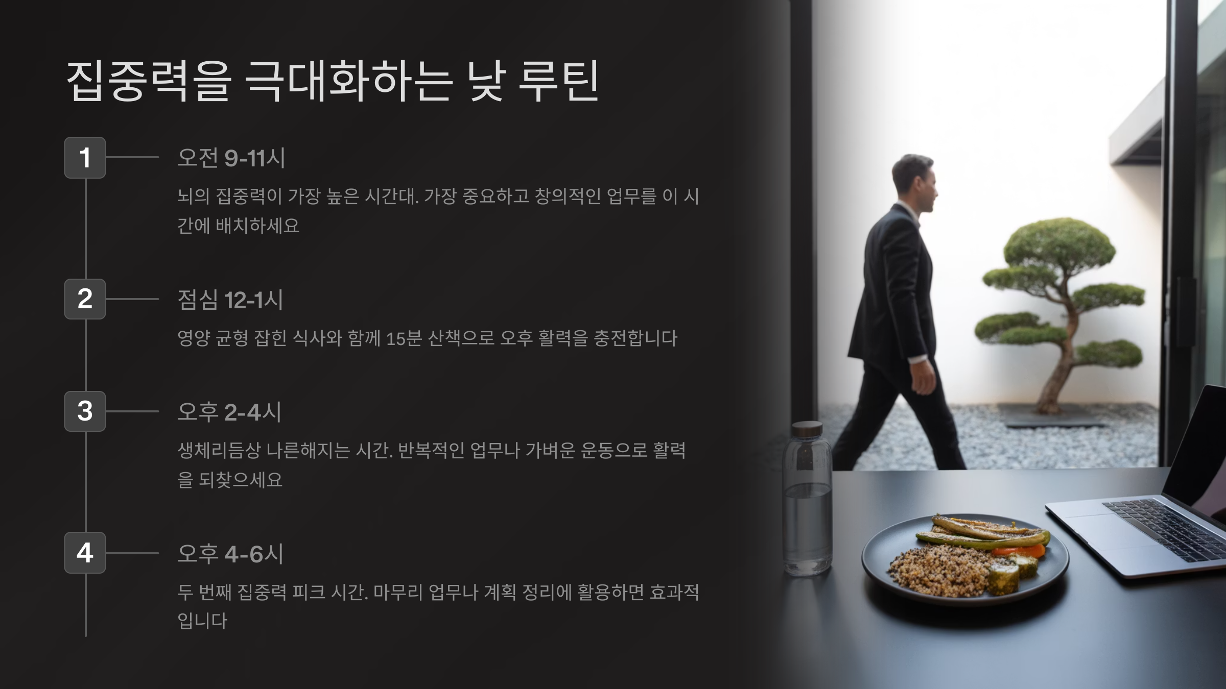 낮 시간대는 가장 에너지 소비가 많은 시간이자, 업무와 학습 능률을 좌우하는 핵심 타이밍이에요. 여기에 맞는 루틴을 심어두면 효율이 쑥 올라가요.