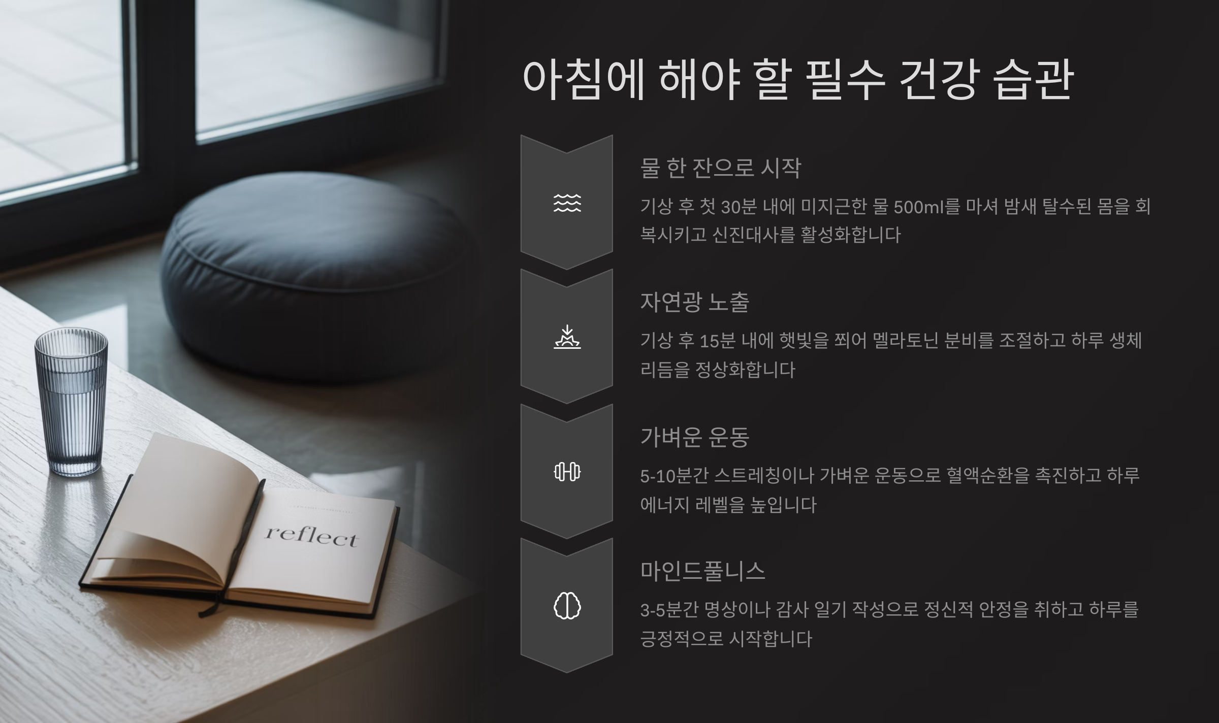 하루를 어떻게 시작하느냐에 따라 그날의 에너지가 달라져요. 아침 루틴은 신체 시계를 리셋하고, 뇌를 깨어나게 해주는 강력한 자극이에요.
