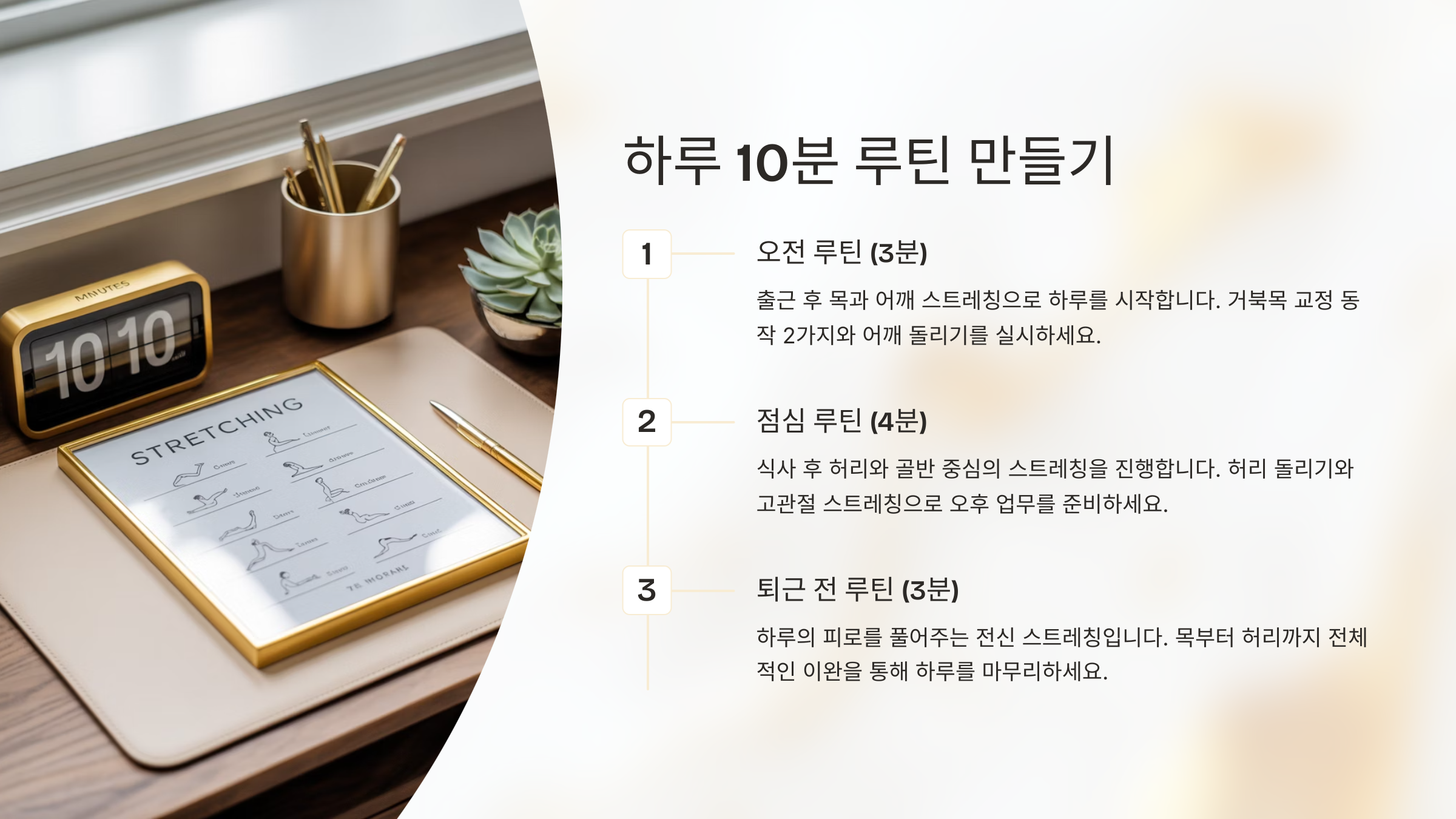 앞에서 배운 스트레칭 동작들을 ‘하루 10분 루틴’으로 묶어볼게요. 짧지만 전신을 골고루 풀어주고, 체형을 정렬하는 데 최적화된 구성이에요. 직장인이라면 누구나 따라 할 수 있도록 동선도 간단하게 짜봤어요.