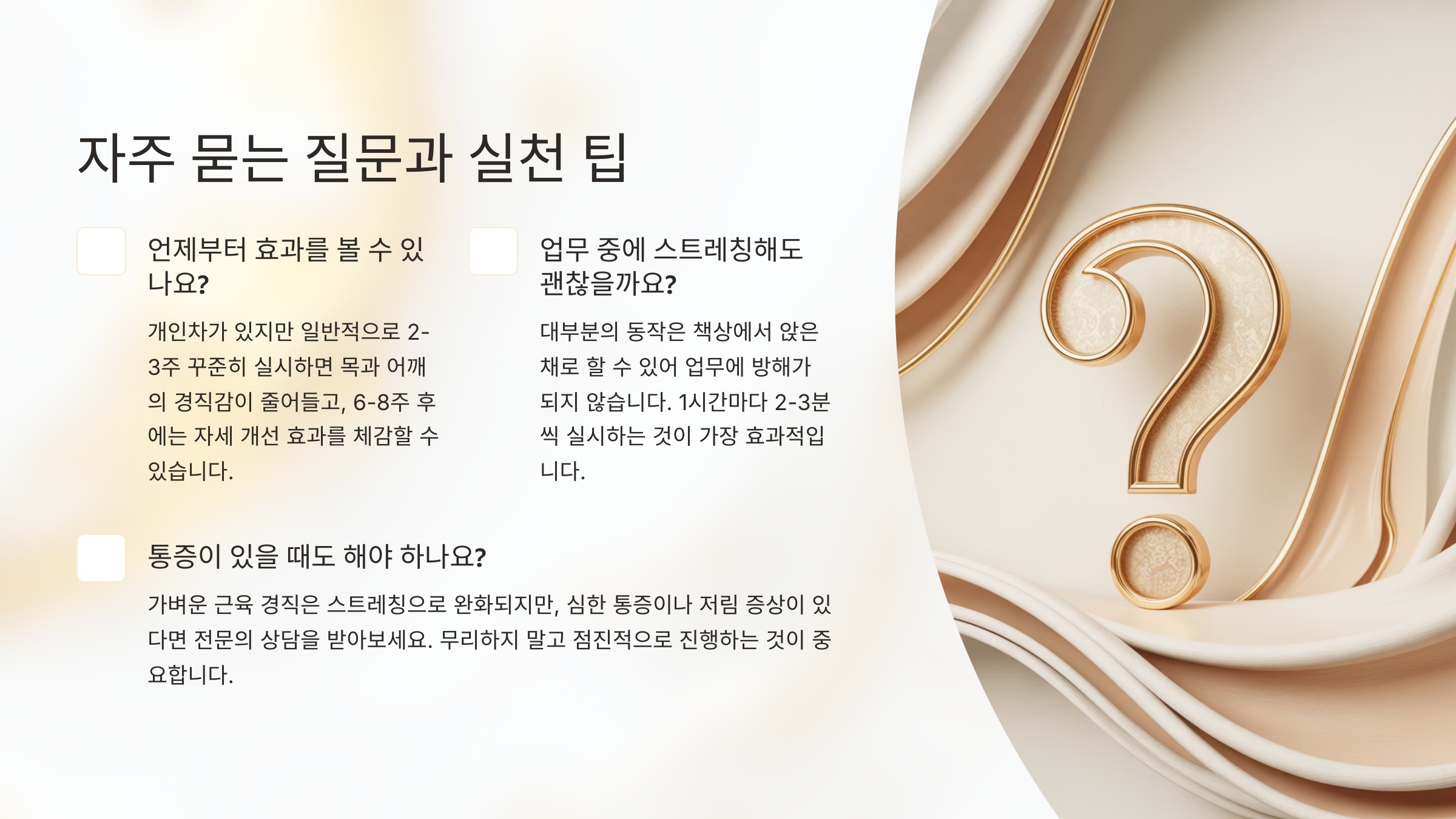 A8. 그럼요! 지금 의자에 앉아 있다면 턱 당기기부터 시작해보세요. 단 1분이라도 실천하면, 내 몸은 분명히 기억하고 반응해줄 거예요.
