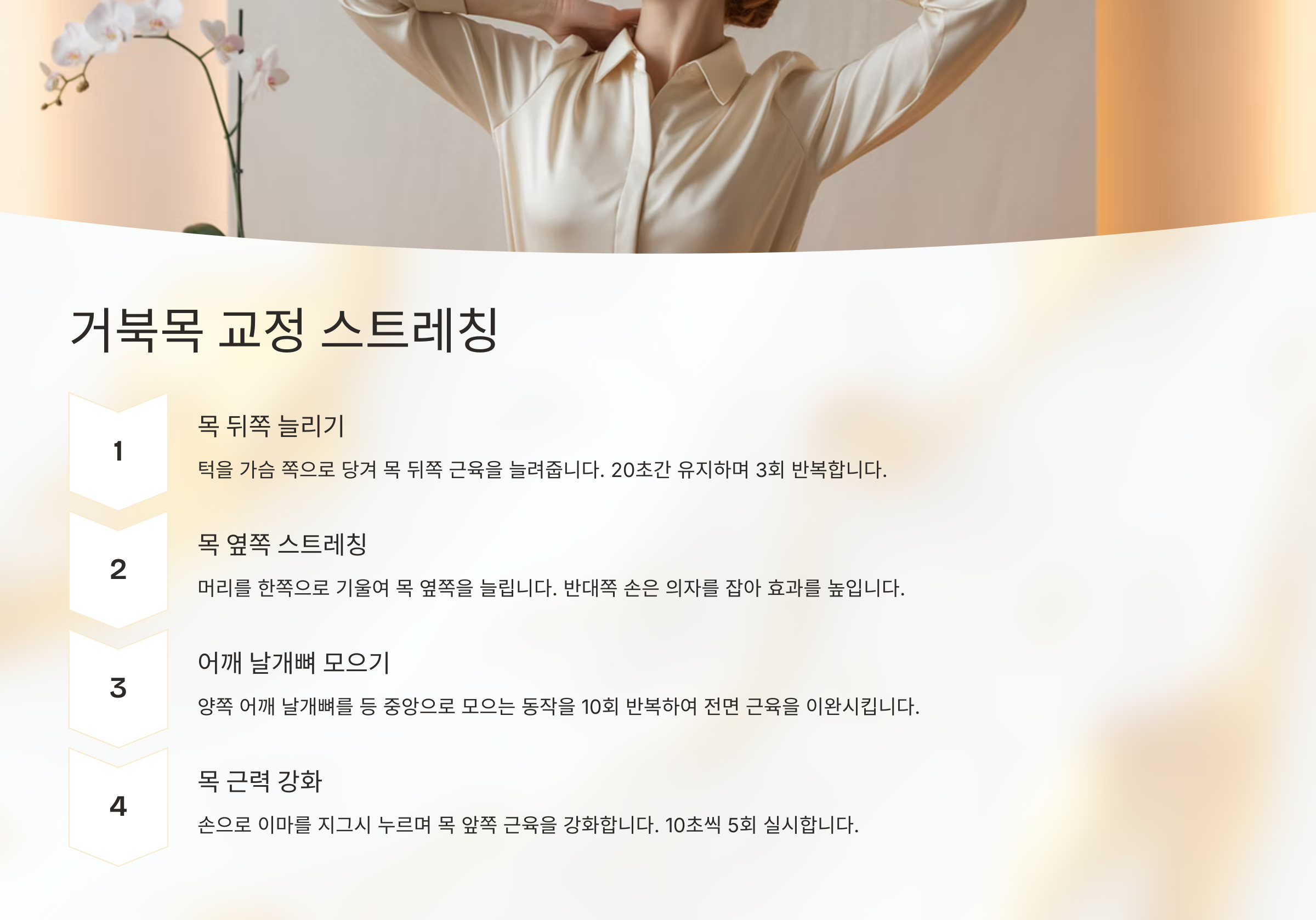 | 1. 턱 당기기 | 정면을 보며 턱을 가볍게 뒤로 당긴 채 5초 유지 |