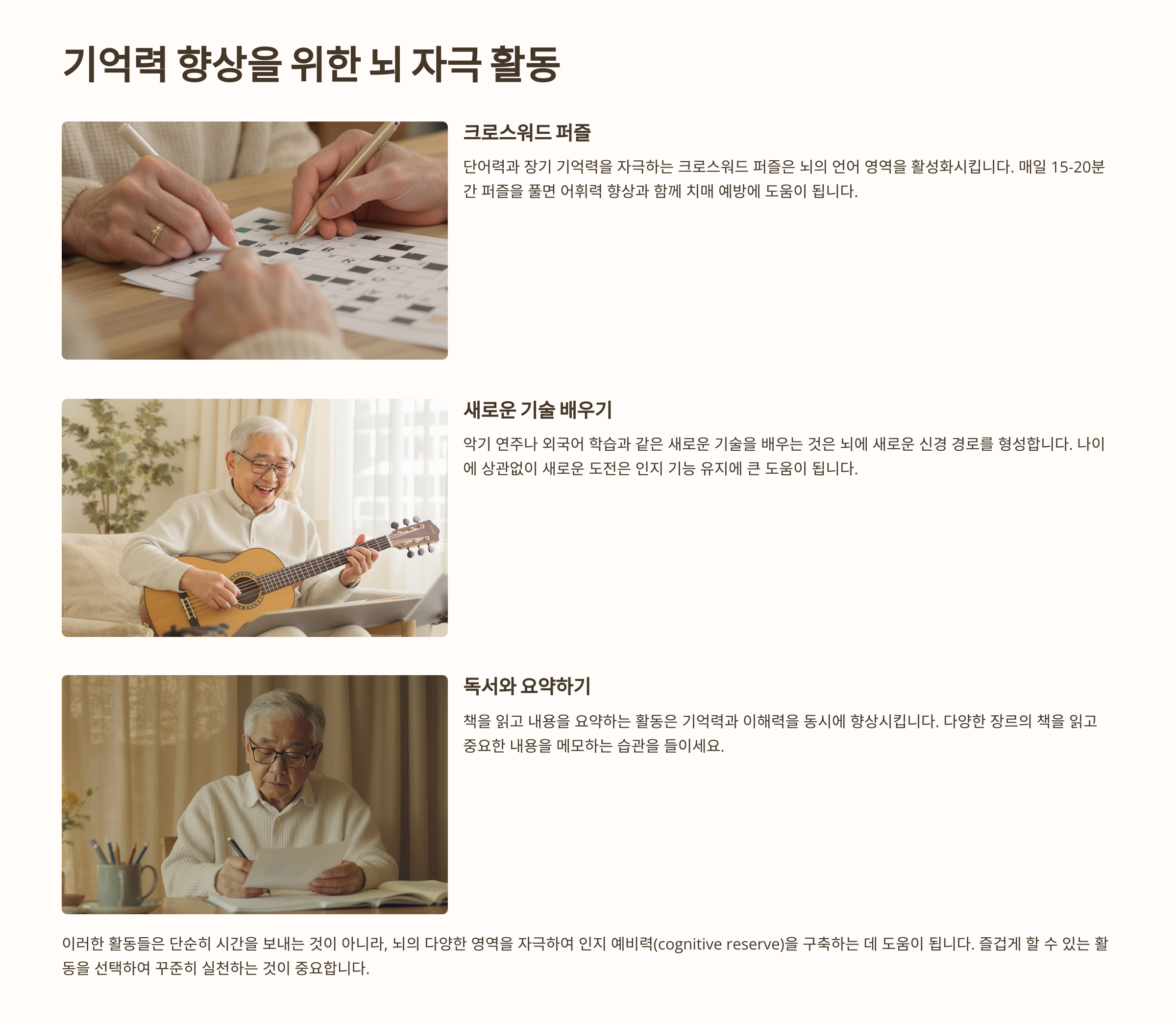 내가 생각했을 때 치매 예방은 지금 당장 시작할 수 있는 작은 습관에서부터 시작돼요. 퍼즐을 풀거나 친구와 대화를 나누는 일조차 뇌에는 자극이 되거든요.
