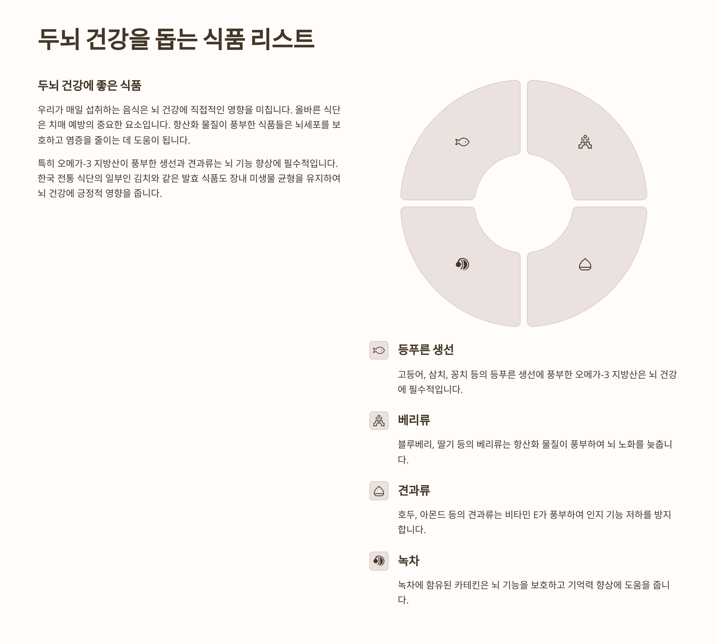 뇌는 우리 몸에서 가장 에너지 소모가 많은 기관이에요. 그래서 두뇌가 잘 작동하려면 영양 공급이 정말 중요해요. 특히 항산화, 오메가-3, 비타민 B군이 풍부한 식품이 핵심이에요.