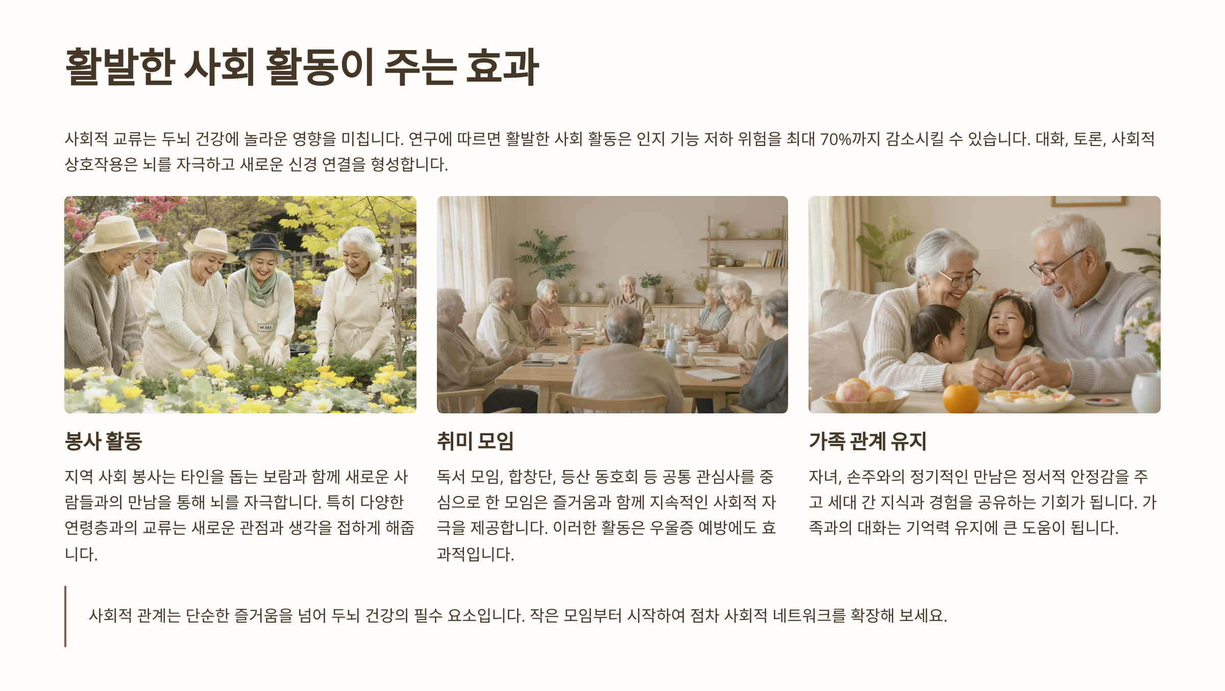 혼자 있는 시간보다 누군가와 함께하는 시간이 두뇌에 훨씬 좋아요. 대화와 감정 교류가 뇌를 끊임없이 자극하기 때문이에요.