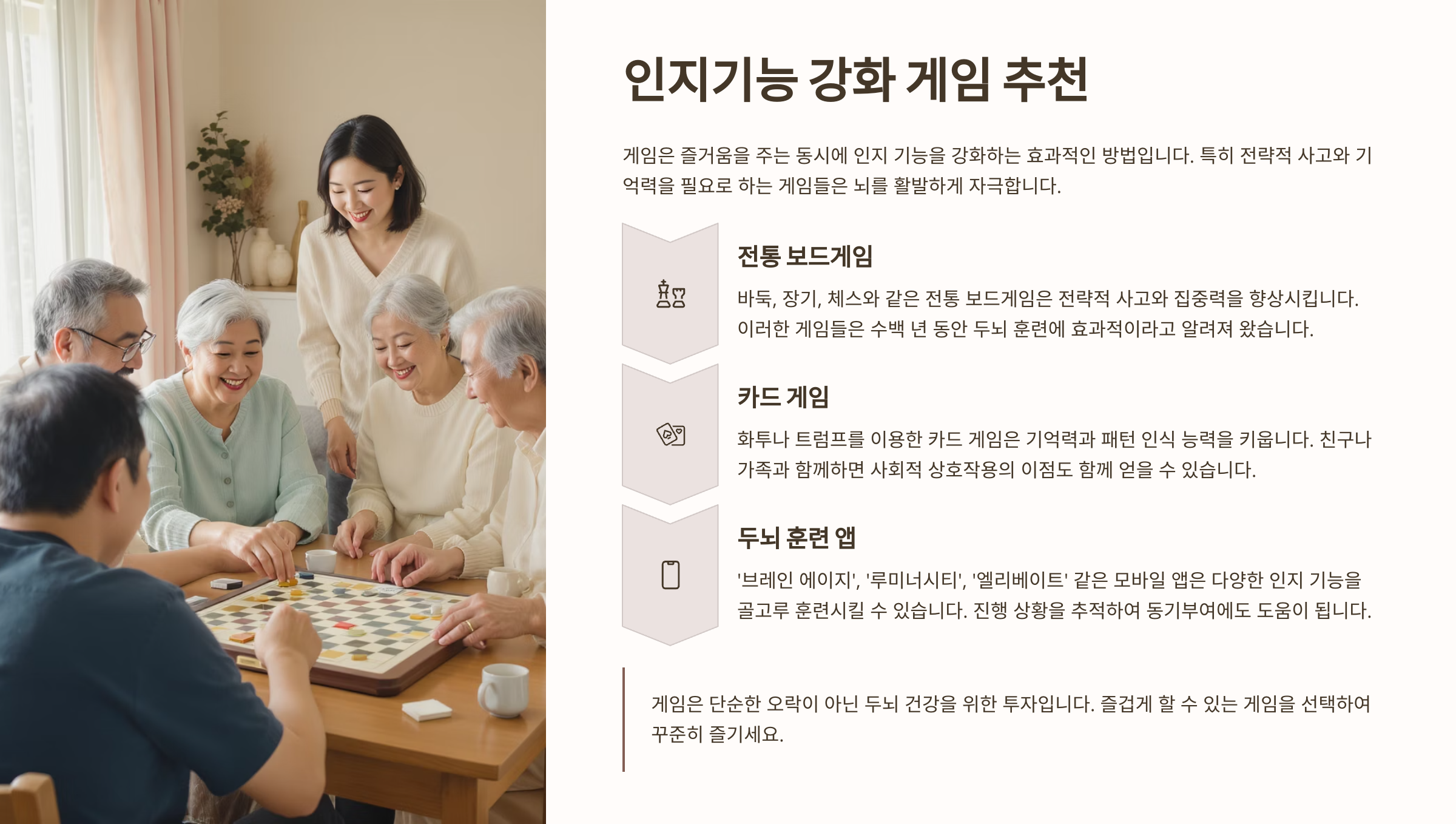 게임도 잘 활용하면 치매 예방에 큰 도움이 돼요. 특히 문제 해결력, 기억력, 판단력 등을 활용하는 게임은 뇌를 자극하면서 인지 능력을 유지하는 데 효과적이에요.