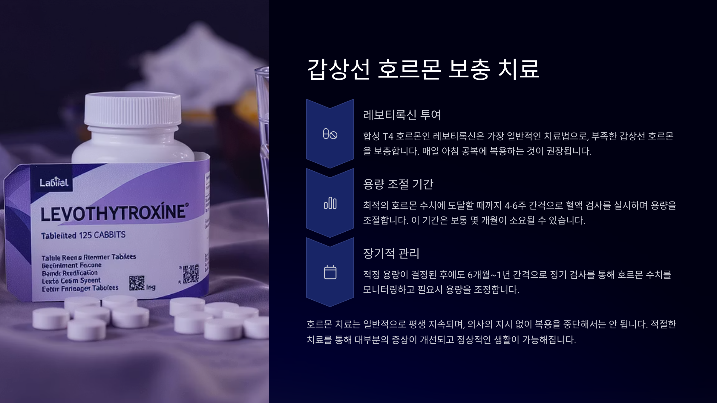 갑상선 기능 저하증은 부족한 호르몬을 외부에서 보충해주는 약물치료가 핵심이에요. 일반적으로는 레보티록신(Levothyroxine)을 복용하게 돼요.