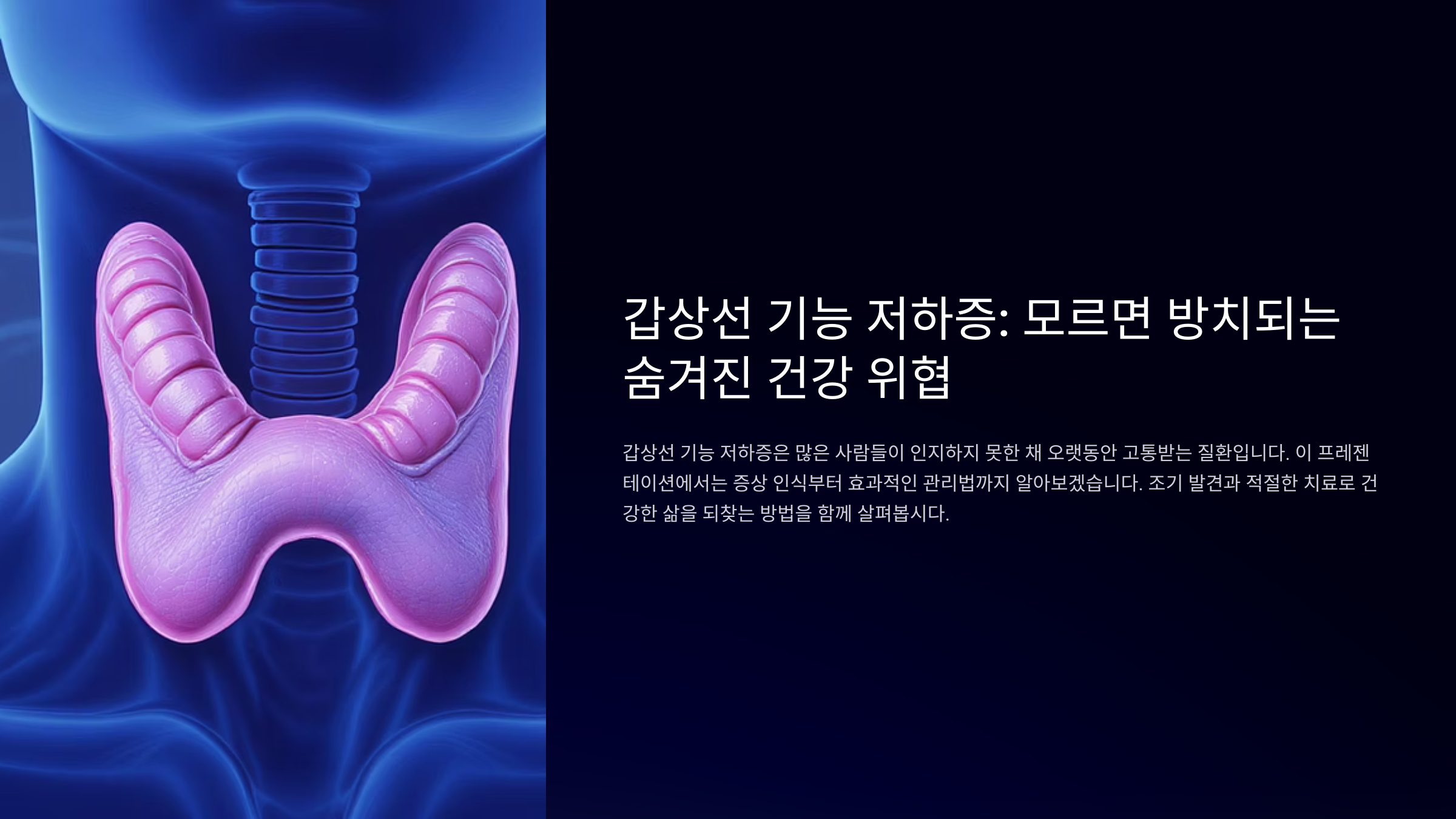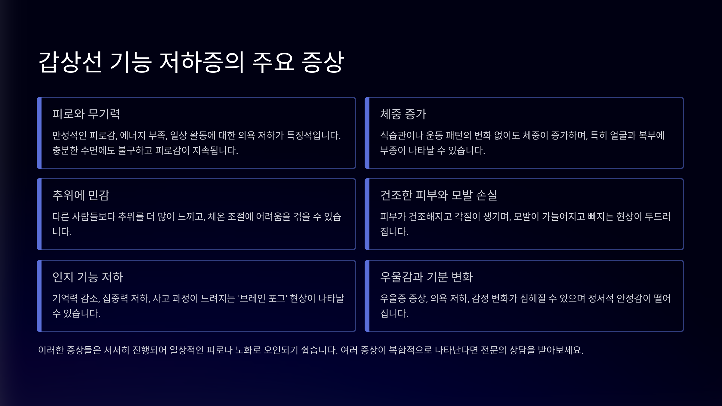 갑상선은 우리 몸의 대사를 조절하는 중요한 호르몬을 만드는 기관이에요. 이 기능이 떨어지면 전신에 걸쳐 다양한 문제가 발생할 수 있어요.