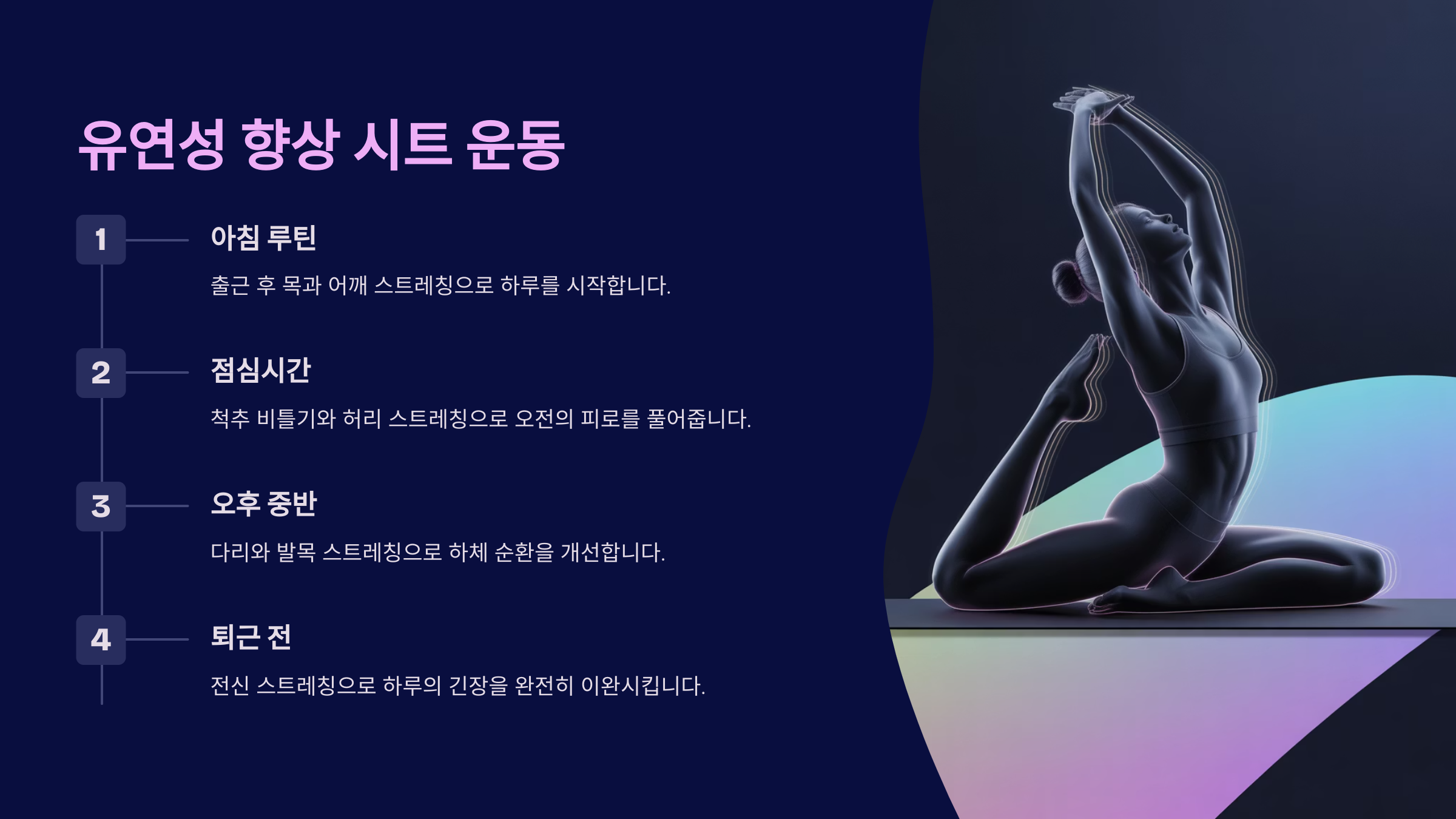 유연성은 단지 스트레칭을 잘하는 능력을 넘어서, 전신 균형과 자세를 바르게 유지하는 데 필수 요소예요. 특히 오래 앉아 있으면 뻣뻣해지는 근육을 방치하게 되고, 이는 허리통증이나 관절 부상으로 이어질 수 있어요.