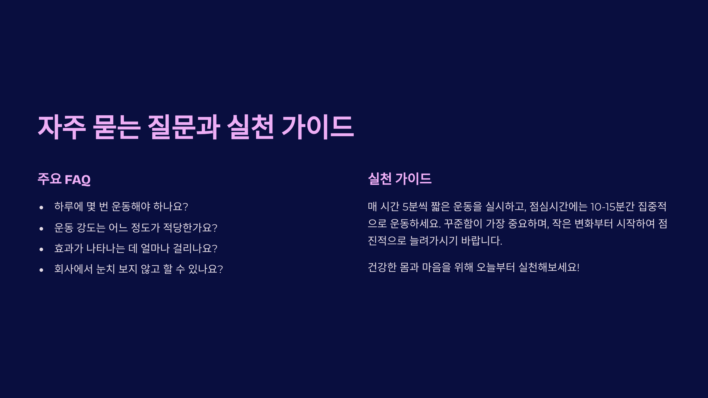 이 동작들은 모두 한 세트를 기준으로 하루 3회만 반복해도 충분한 효과가 있어요. 점심 전, 오후 업무 중간, 퇴근 직전 이렇게 3번만 실천해도 몸이 훨씬 가볍고 덜 뻐근해질 거예요.