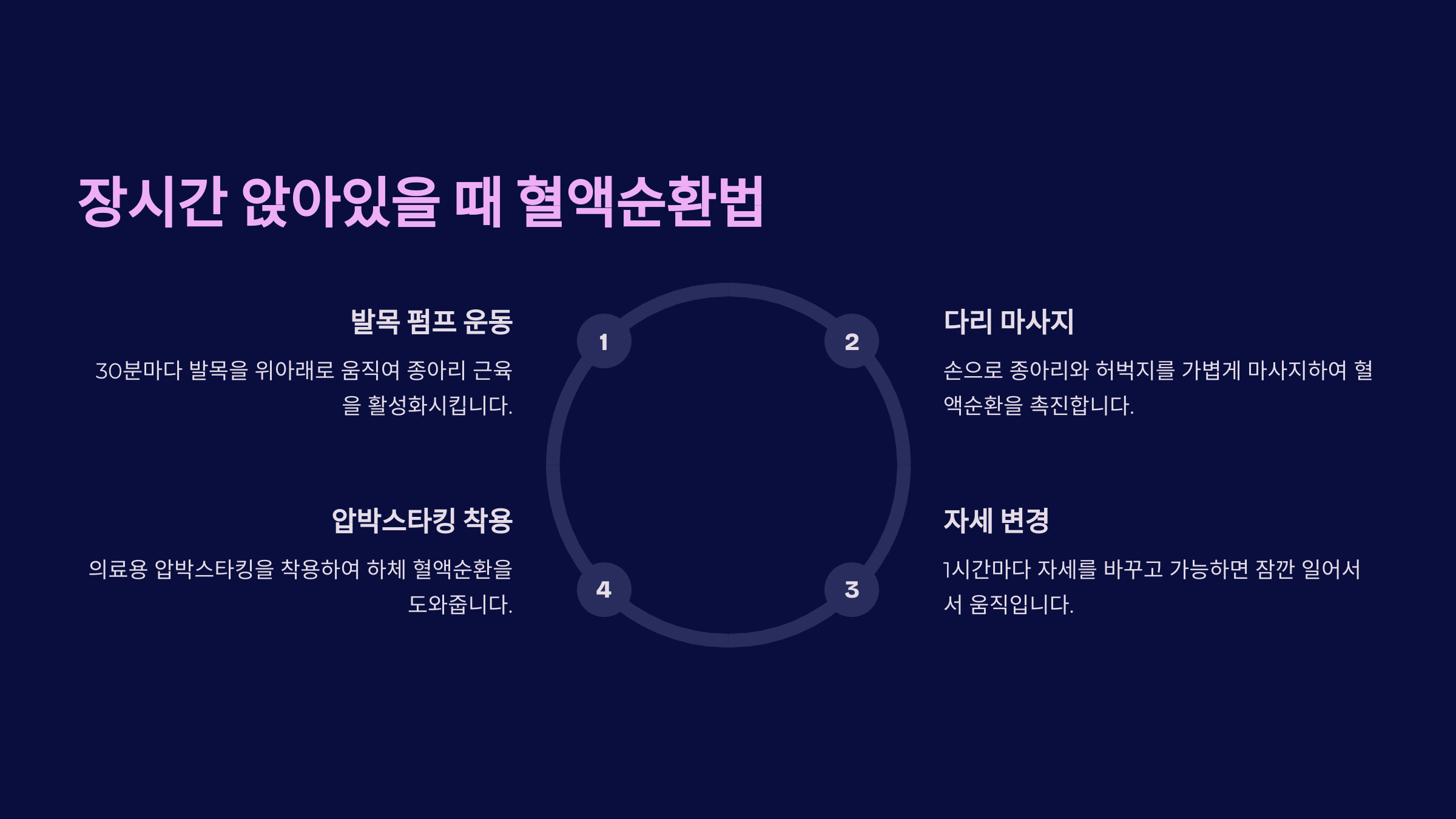 작은 움직임이지만 매일 반복하면 다리 붓기, 피로감, 저림 증상이 훨씬 줄어드는 걸 직접 느낄 수 있을 거예요. 지금 이 순간에도 앉아 있다면, 바로 발끝부터 움직여보세요!