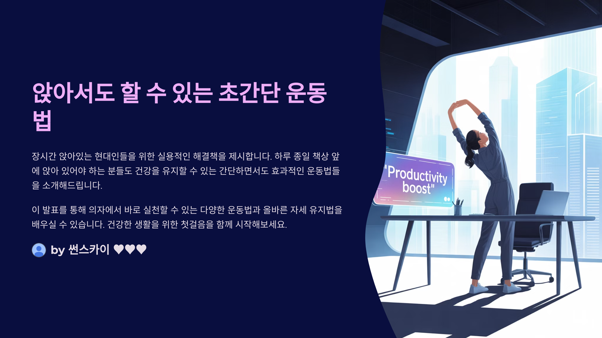 하루 대부분을 앉아서 보내는 현대인들에게 꼭 필요한 정보예요! ‘의자에 앉아있을 때도 운동이 될까?’ 하는 의문이 들지만, 앉은 자세에서도 충분히 건강을 챙길 수 있는 간단한 운동들이 많아요. 특별한 공간 없이, 사무실이나 집에서 바로 따라 할 수 있다는 게 가장 큰 장점이에요.