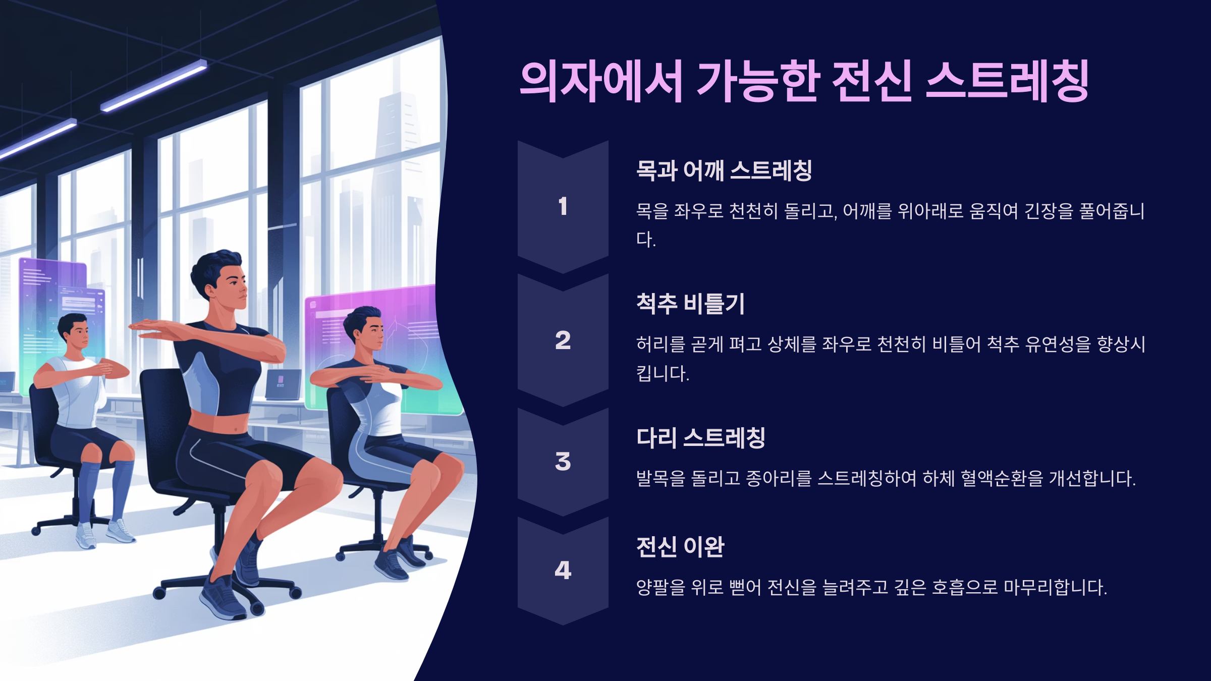 의자에서 하는 전신 스트레칭은 근육을 이완시키고 뭉친 부위를 풀어주기 때문에 앉아서 오랜 시간 일하는 사람들에게 꼭 필요한 루틴이에요. 간단하면서도 효과가 크기 때문에 하루 몇 분만 투자해도 몸이 가벼워지는 걸 느낄 수 있어요.